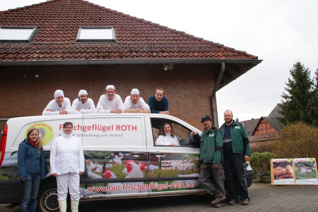 1996 begann Markus Roth mit der Haltung von Geflügel nach Bioland Richtlinien, nachdem er sein landwirtschaftliches Studium in Witzenhausen abgeschlossen hatte. Los ging es mit Hähnchen, später kamen Puten dazu. Heute umfasst das Sortiment auch Enten, Gänse, Brüderhähne, Suppenhühner usw. welche von Bioland Geflügelhaltern aus der Region zugekauft werden. Von 1996 bis 2003 musste das Geflügel zu anderen Schlachtereien transportiert & verarbeitet werden bis eine eigene Schlachterei gekauft werden konnte. Seitdem zeichnet uns aus, dass wir nicht nur (einen Großteil) des Geflügels selber aufziehen, sondern auch selbst einfangen, transportieren, schlachten, zerlegen, verpacken und ausliefern. So kann entlang der gesamten Produktionskette die Einhaltung unserer hohen Standards bezüglich Tierwohl, Fleischqualität , Hygiene und Frische gewährleistet werden, ohne von anderen Abhängig zu sein. Ebenfalls erlaubt es eine hohe Flexibilität um auf besondere oder kurzfristige Kundenwünsche einzugehen. Überzeugen Sie sich selbst und besuchen Sie unseren Geflügelhof oder Schlachtbetrieb.