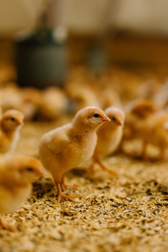 Alle zwei Wochen begrüßen wir rund 1.200 frisch geschlüpfte Eintagsküken, die wir von der Bioland-Brüterei Overmeyer in der Nähe von Osnabrück beziehen. In den ersten Lebenswochen benötigen die Tiere vor allem Wärme, Ruhe und einen trockenen, hellen Stall.